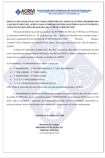EDITAL PARA ELEIÇÃO DA NOVA MESA DIRETORA DA ASSOCIAÇÃO DOS CRIADORES DO VALE DO ITAPECURU-ACRIVI, PARA O TRIÊNIO 2025/2028, SEGUINDO O ESTATUTO DESTA ASSOCIAÇÃO QUE SERÁ REALIZADA DIA 17 DE OUTUBRO DE 2025.
