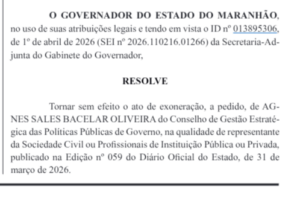 Conforme apurado pelo portal, já consta no Diário Oficial do Estado do Maranhão, na edição desta quarta-feira (01/04), ato que torna sem efeito a exoneração de Agnes Oliveira do Conselho de Gestão Estratégica das Políticas Públicas.