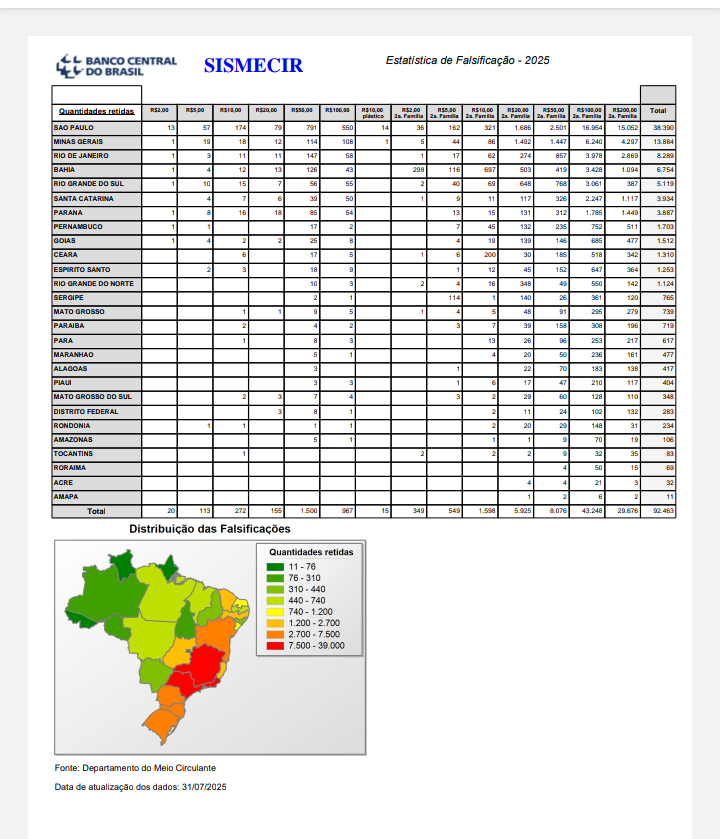 Segundo o relatório divulgado no site do BCB, o Maranhão ocupa a 17ª posição no ranking nacional de dinheiro falso apreendido em 2025. O estado de São Paulo lidera com 38.390 notas falsas, seguido por Minas Gerais (13.884) e Rio de Janeiro (8.289). No Nordeste, o Maranhão é o 6º colocado, atrás de Bahia (6.754), Pernambuco (1.703), Ceará (1.310), Rio Grande do Norte (1.124) e Sergipe (765).